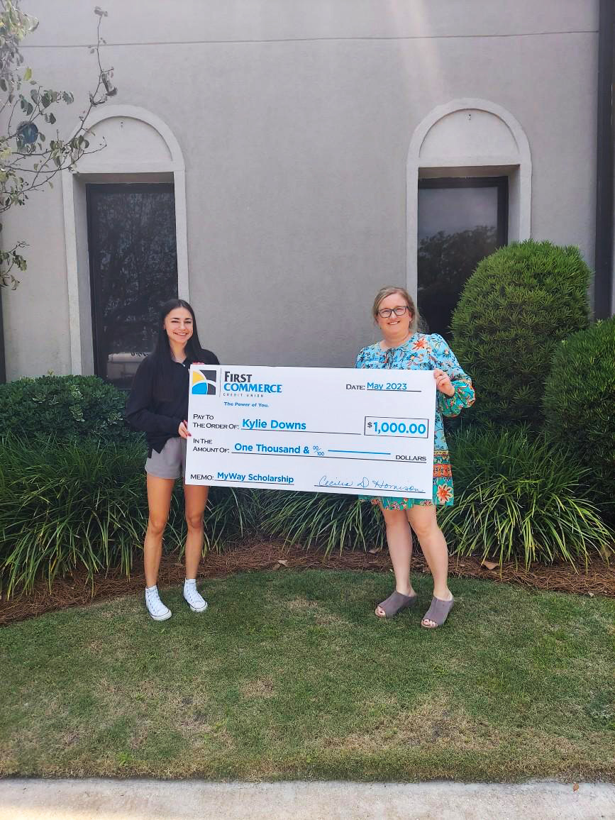 Photo Caption: Mary Katherine Adams (right), First Commerce Credit Union Financial Center Manager at Adel, presented Kylie Downs, Cook High School senior, with her 2023 MyWay Scholarship.
