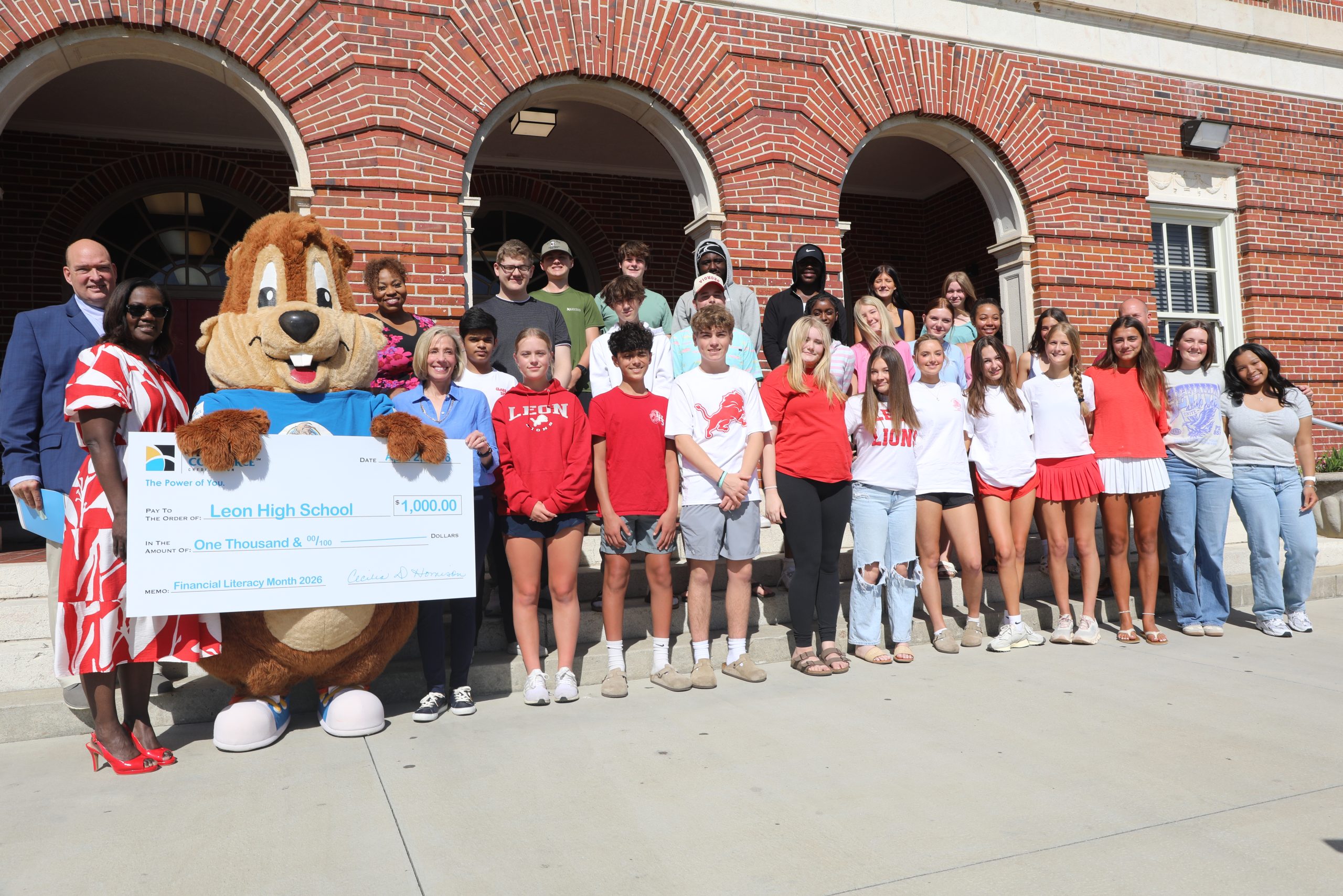 First Commerce Credit Union leaders and Sammy Squirrel, the First Commerce mascot, present Leon High School with a $1,000 gift to beautify the campus with trees.