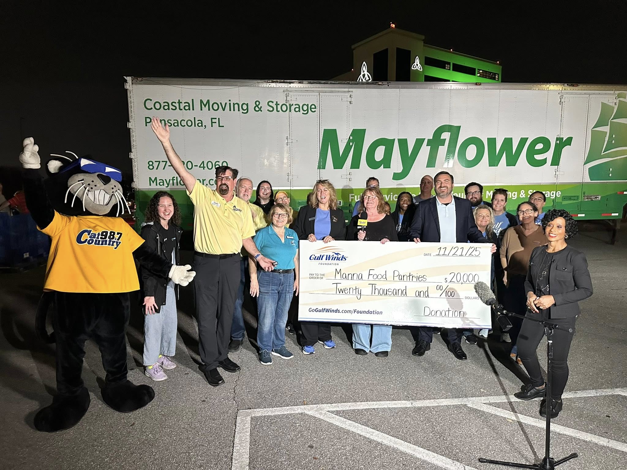 Pensacola, Florida – Gulf Winds Credit Union recently donated $20,000 to Manna and presented the check at their annual Fill the Mayflower event, one of the community’s most impactful annual food-drive events. This year’s donation helps strengthen Manna’s ability to deliver consistent, sustainable hunger relief, supporting programs that ensure children, families, and seniors have dependable access to nutritious food year-round.